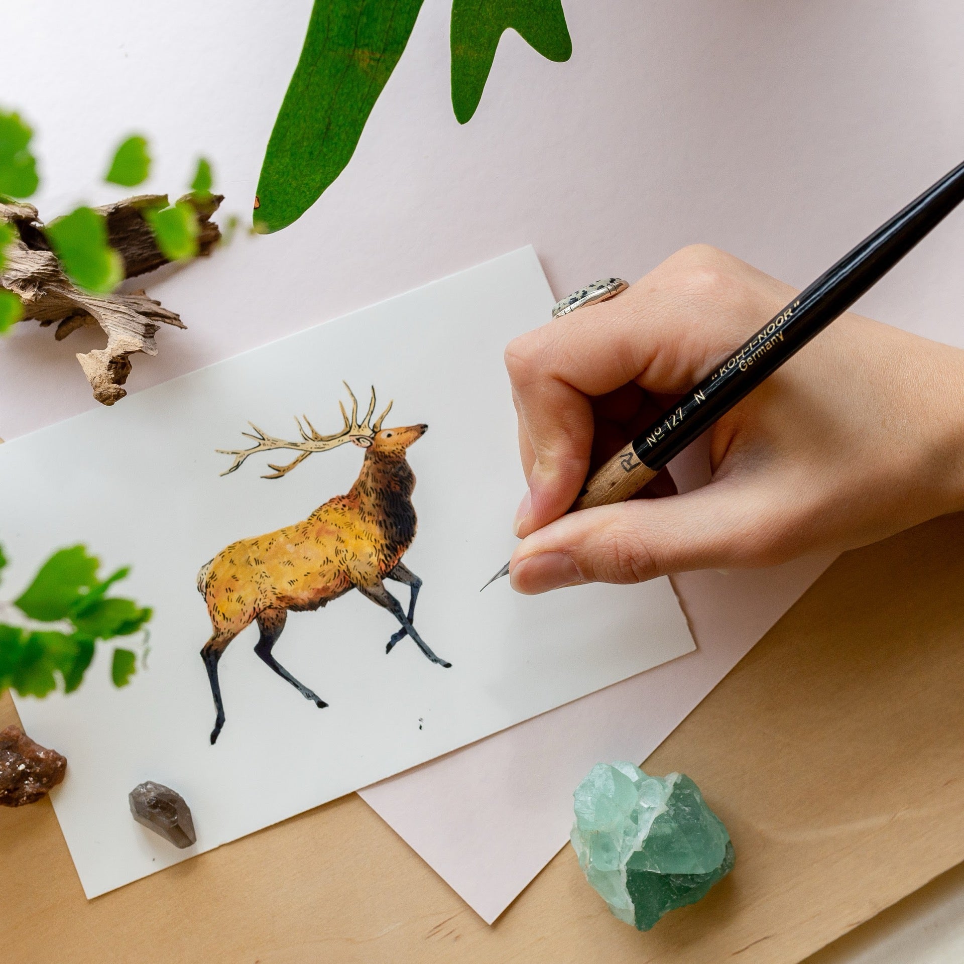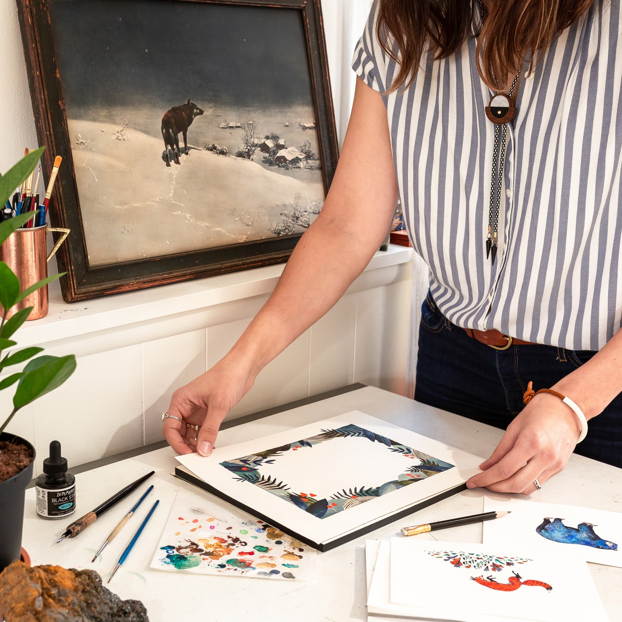 Our plant-filled home studio is like a magical Wunderkammer (wonder cabinet), brimming with treasures from years of Bree’s adventures: rocks from backpacking escapades, feathers from the local bluejays, driftwood from glacial lakes, family heirlooms, and a whole lot more. It’s our personal treasure trove of nature’s finest!