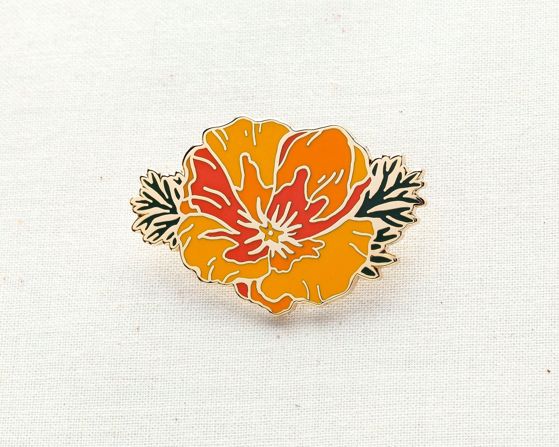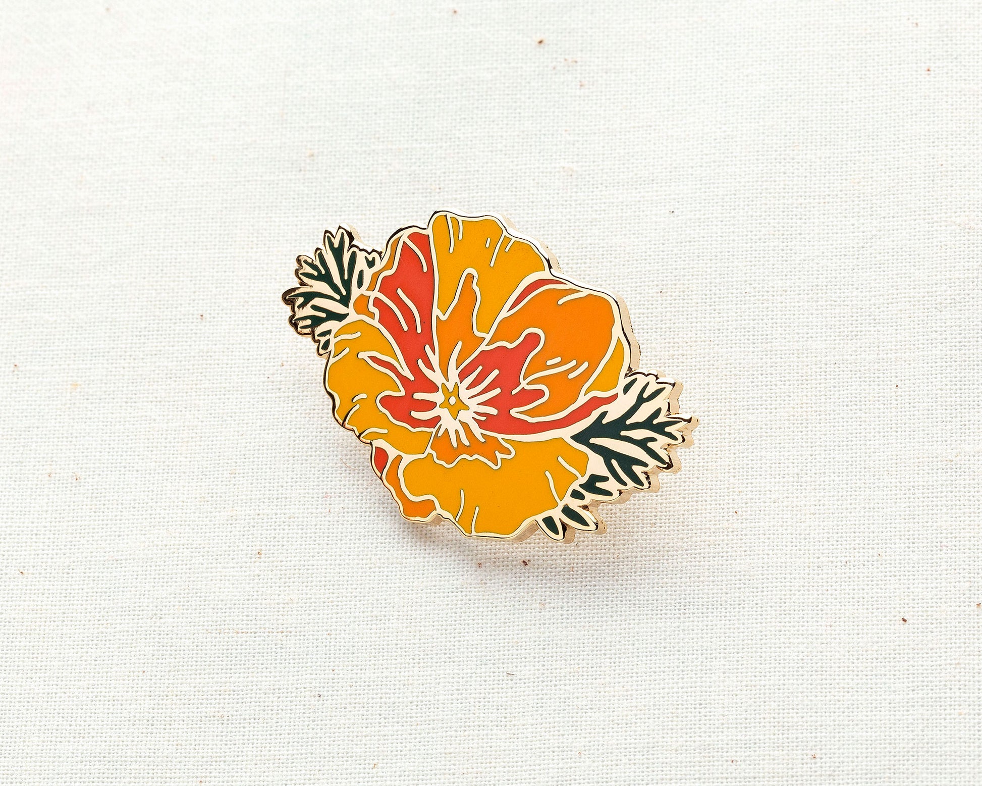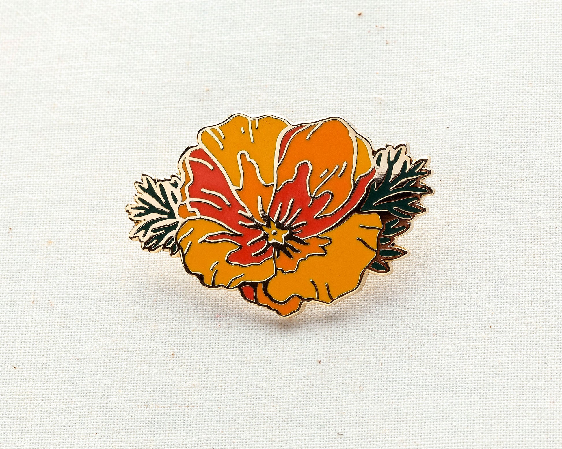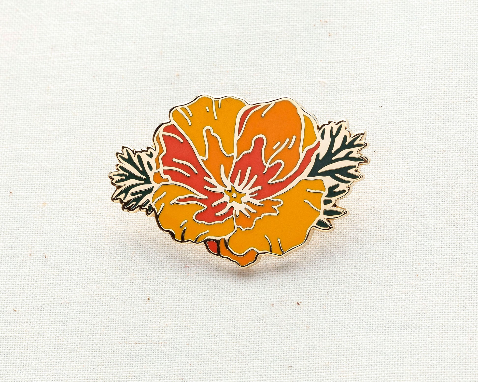 Transport yourself to warm, golden days and a fresh breeze. Native to the Pacific slope of North America and the official state flower of California, this California poppy enamel pin is inspired by walks with bold, blue skies and lively fields of flowers.