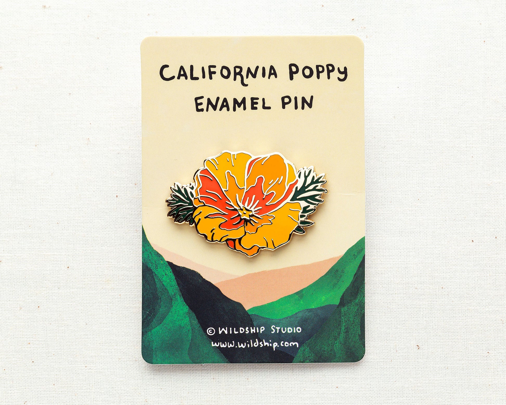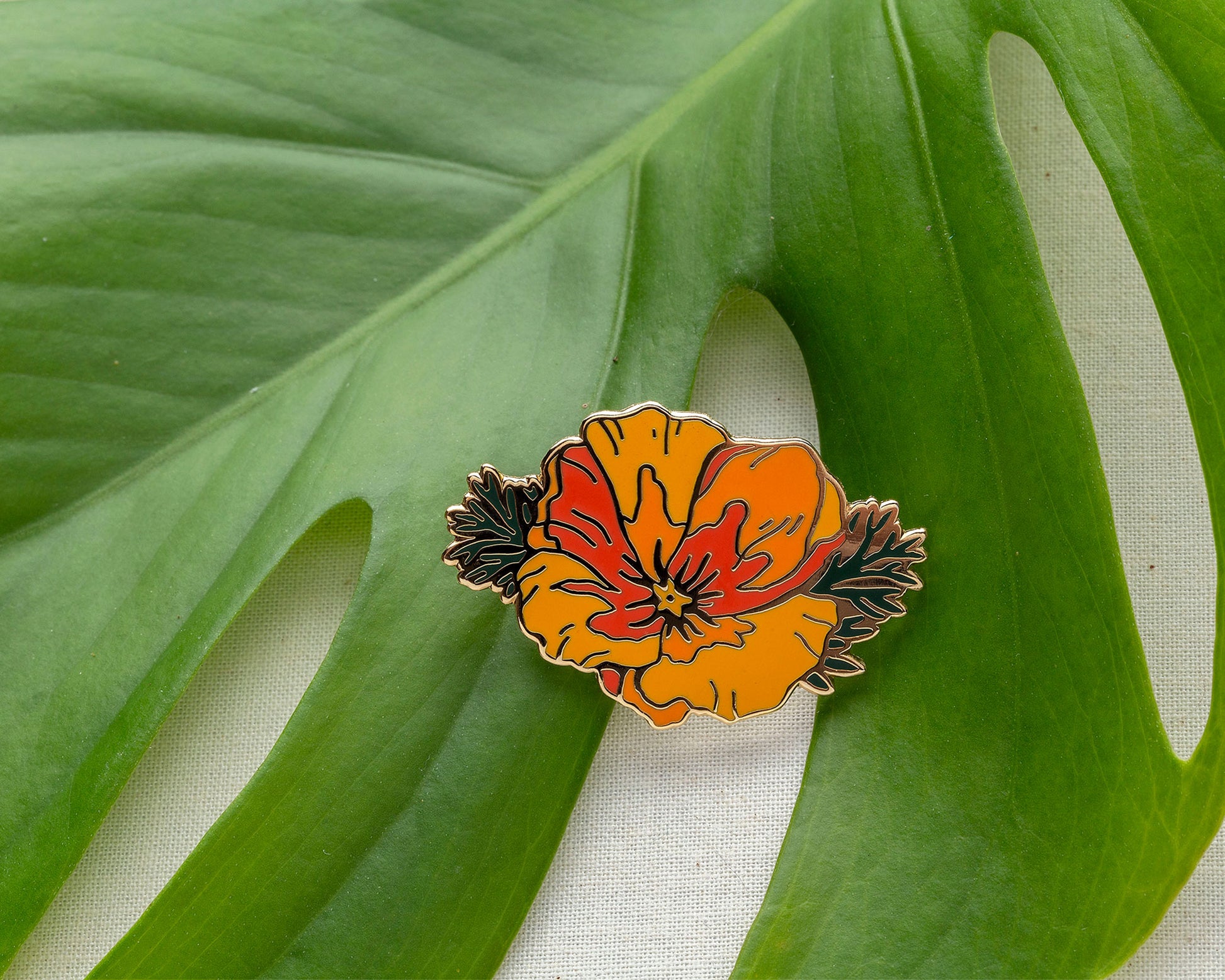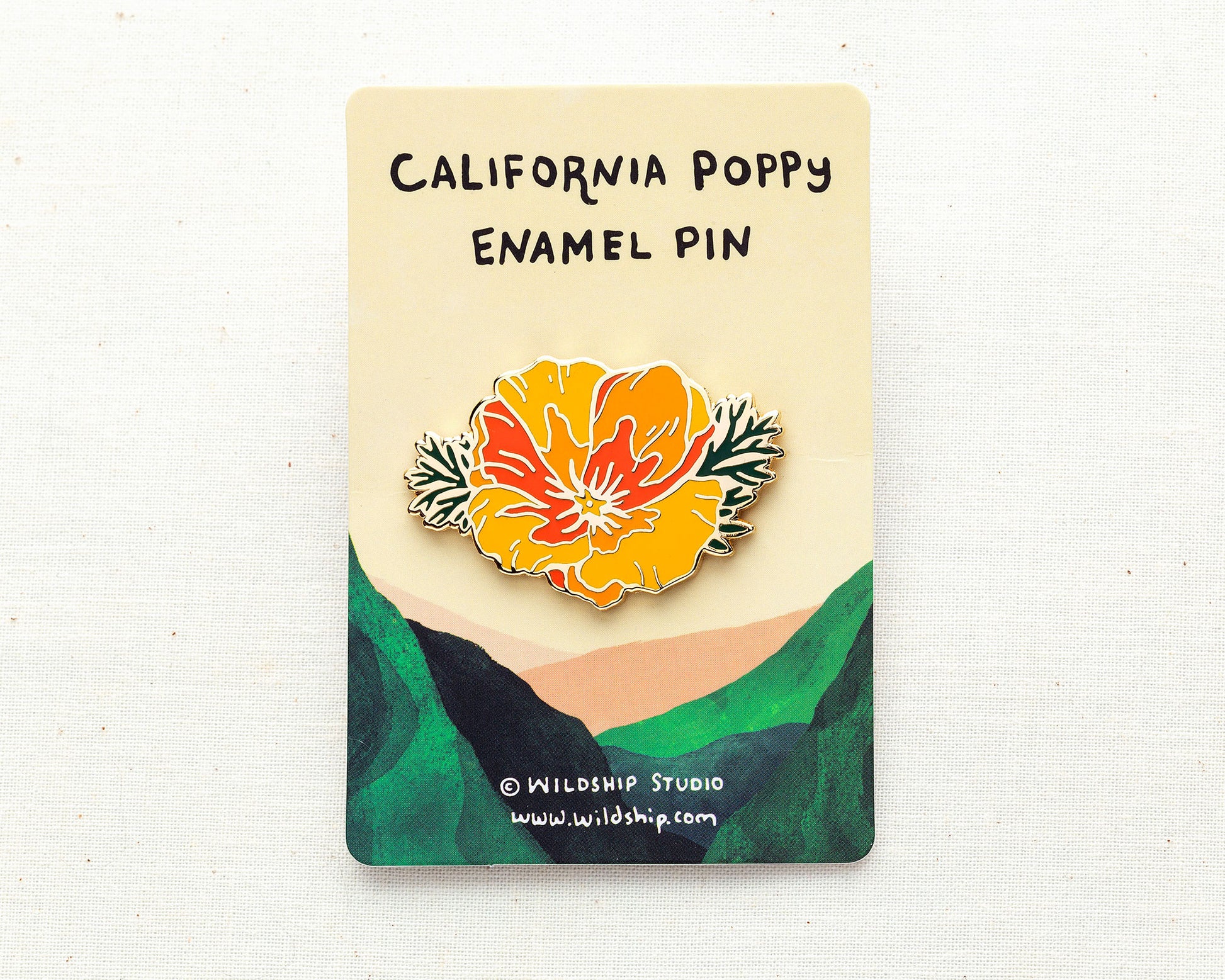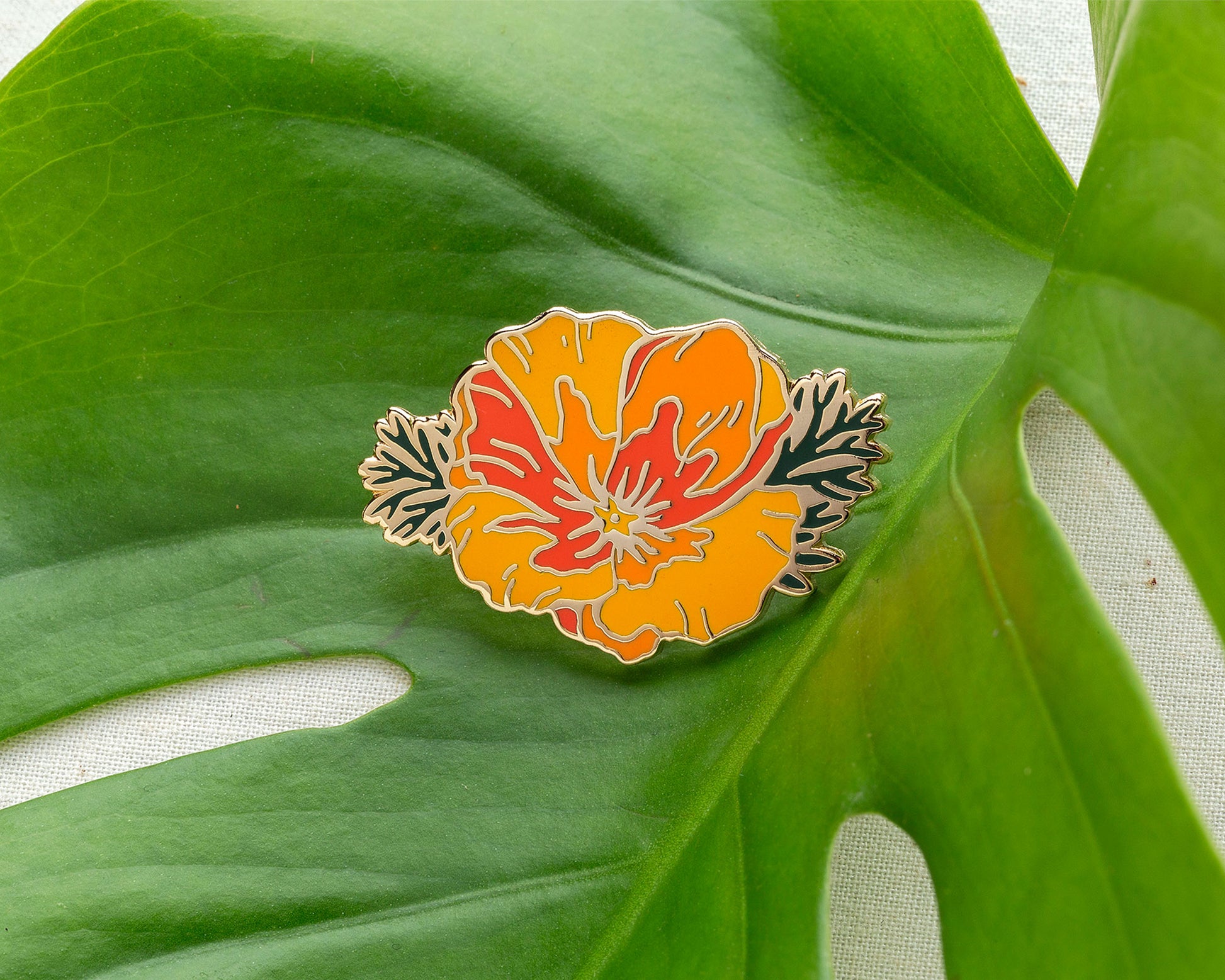 Transport yourself to warm, golden days and a fresh breeze. Native to the Pacific slope of North America and the official state flower of California, this California poppy enamel pin is inspired by walks with bold, blue skies and lively fields of flowers.