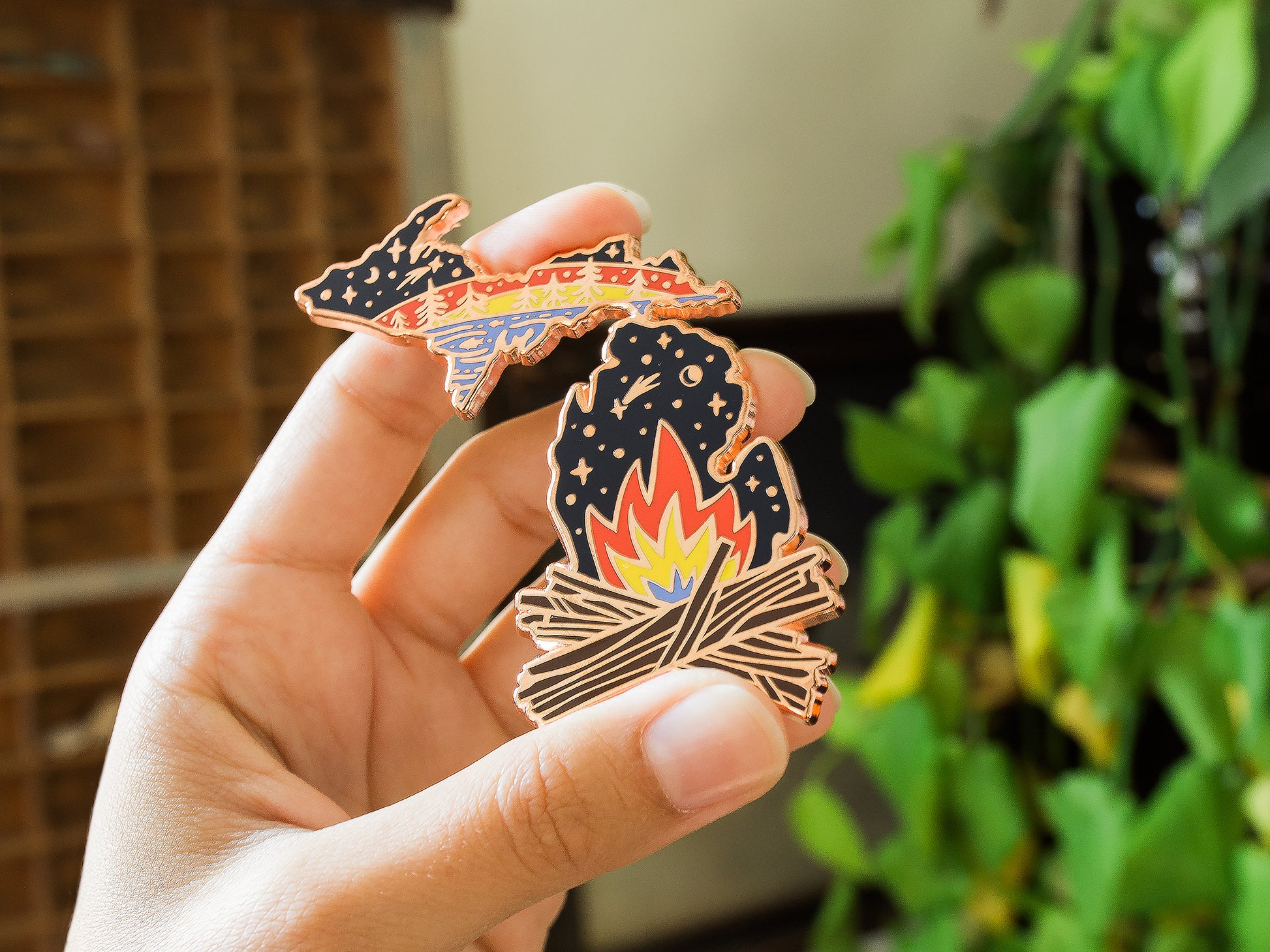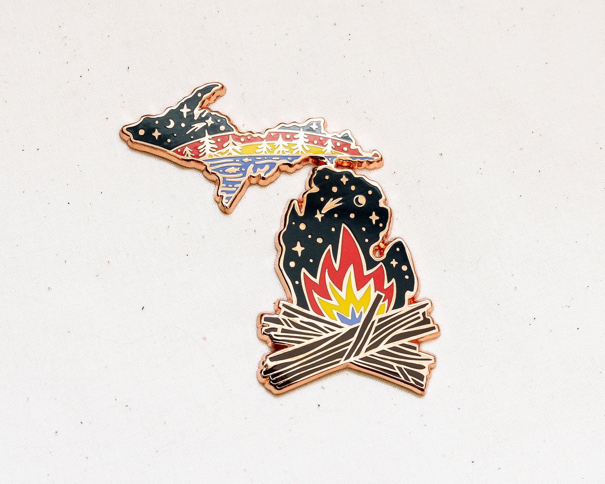 Calling all outdoor enthusiasts and Great Lakes dreamers! Our “Michigan Campfire Magic” enamel magnet is here to turn your fridge into a mini adventure. Featuring the beloved state of Michigan, with its iconic shape lit up by starry skies, sunlit shorelines, and a cozy campfire crackling away, this magnet is your perfect reminder of campfire tales and star-gazing nights.
