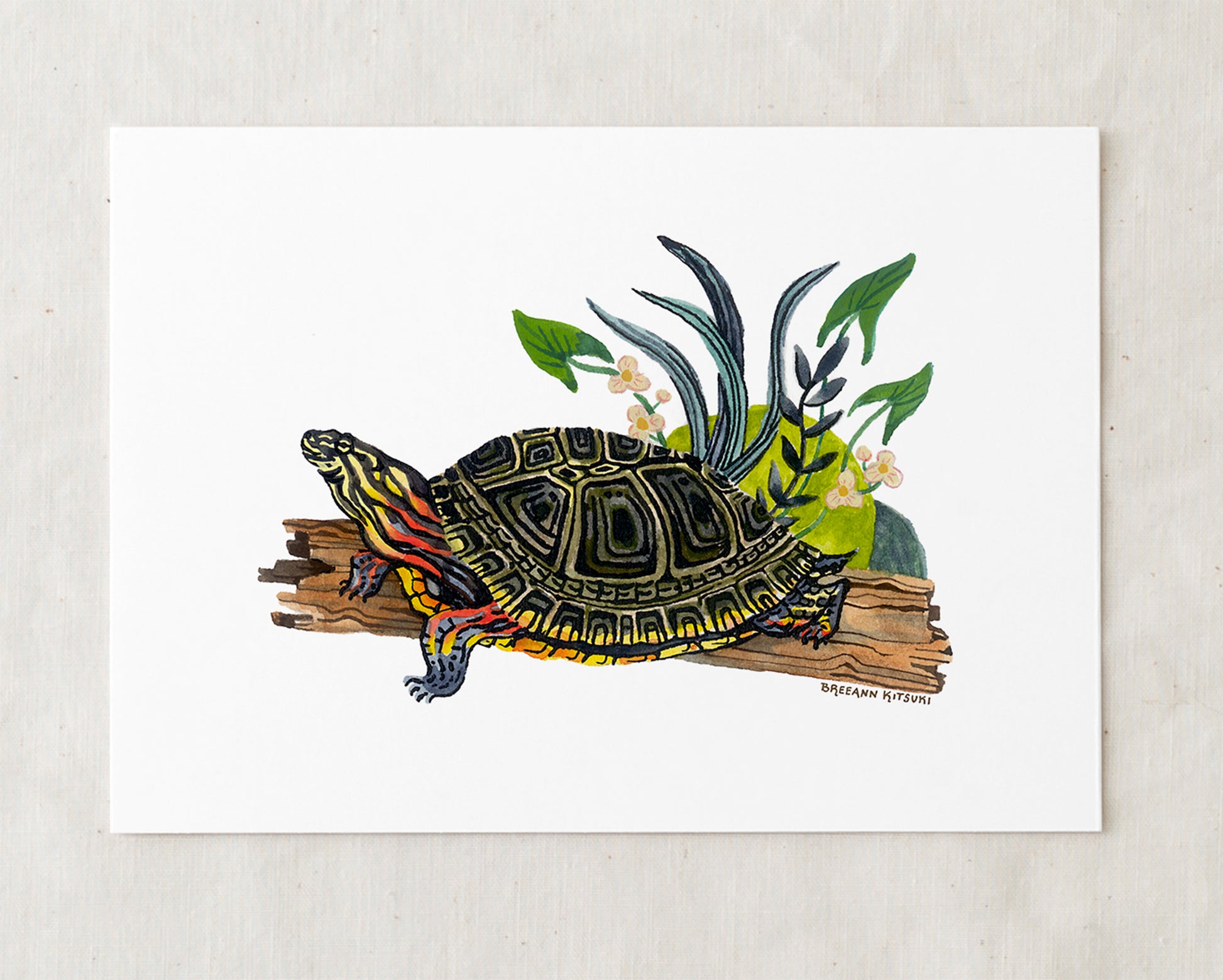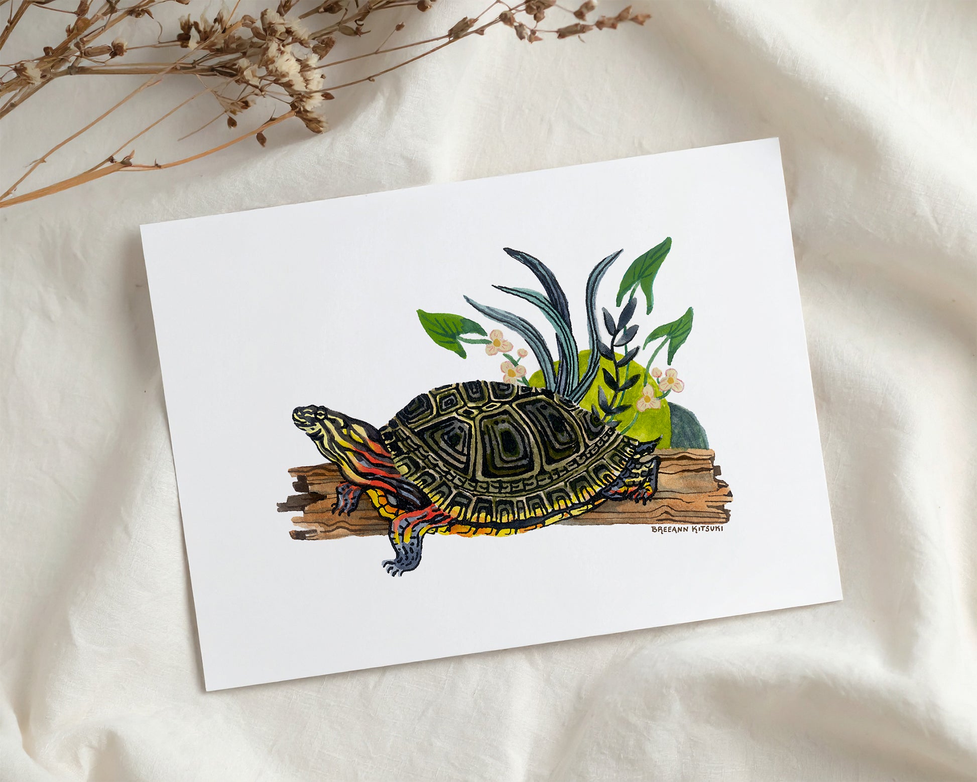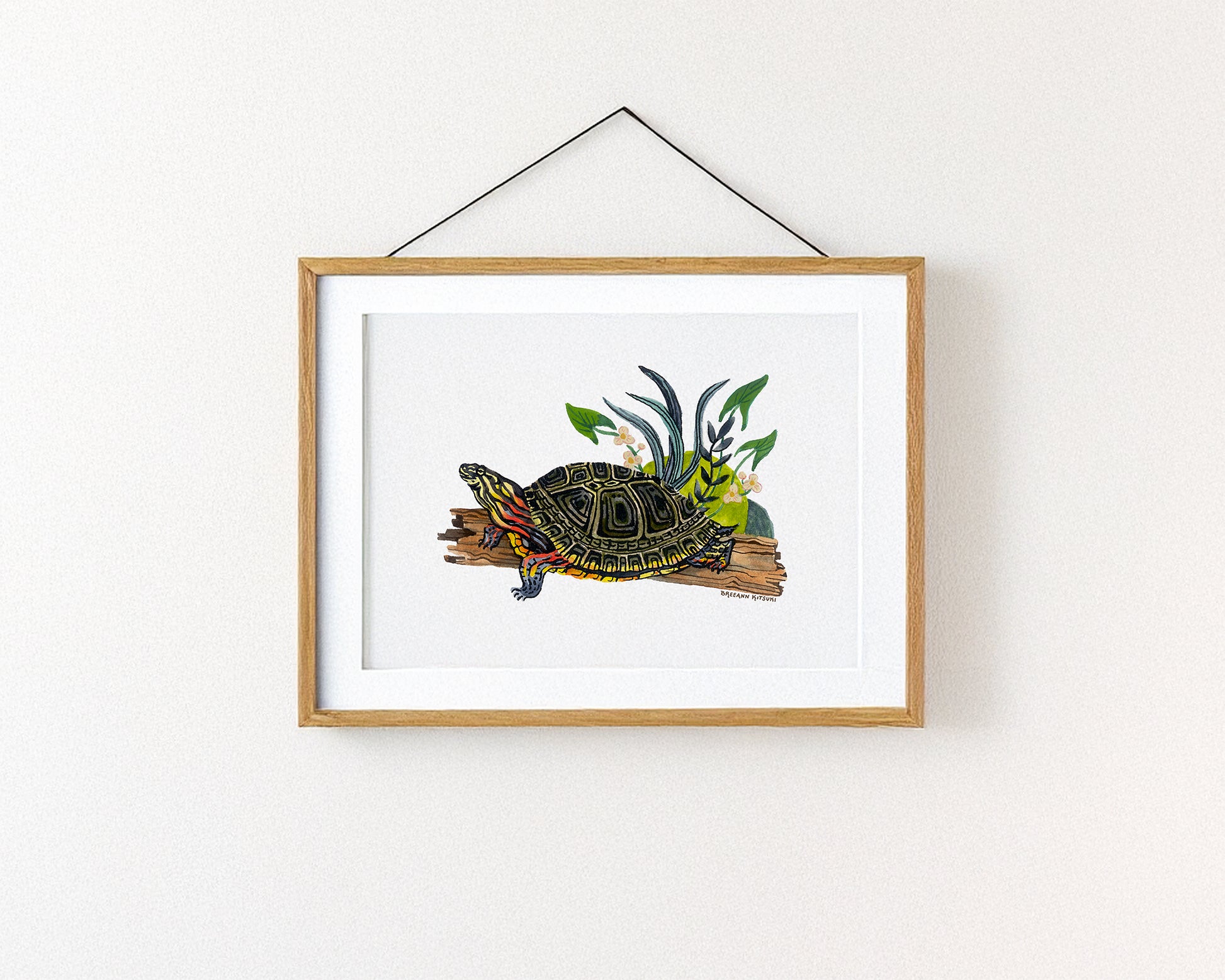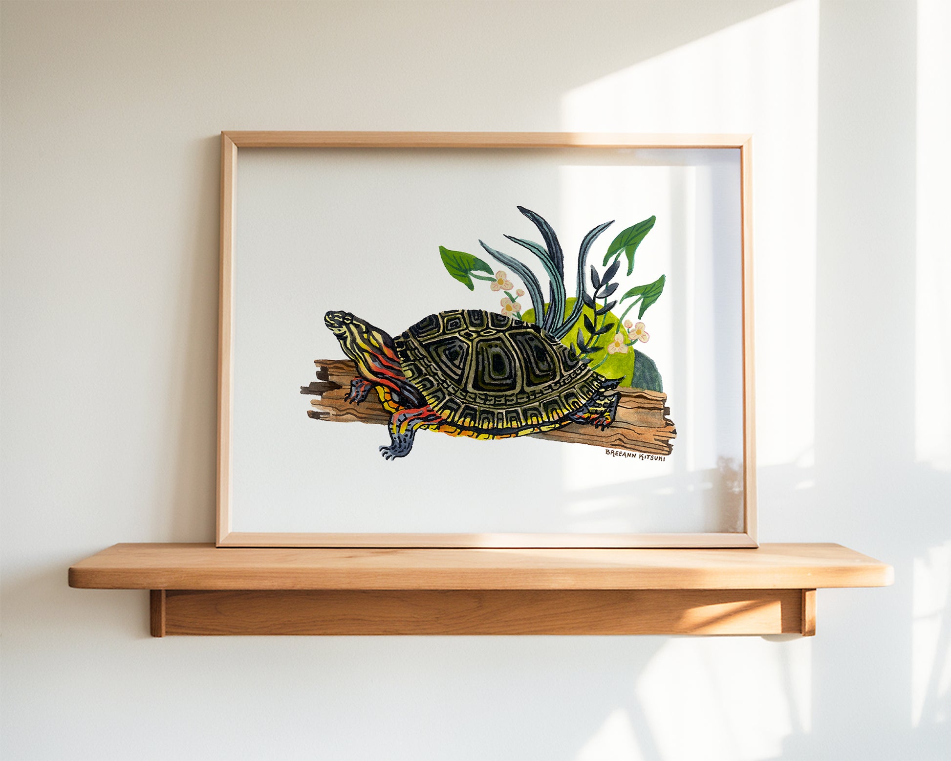 This painted turtle doesn’t just crawl — it struts. With stripes sharper than your best comeback and a shell that screams ‘fashion icon,’ it’s slow, sure, but never boring. Put this colorful diva on your wall and let the attitude splash in!