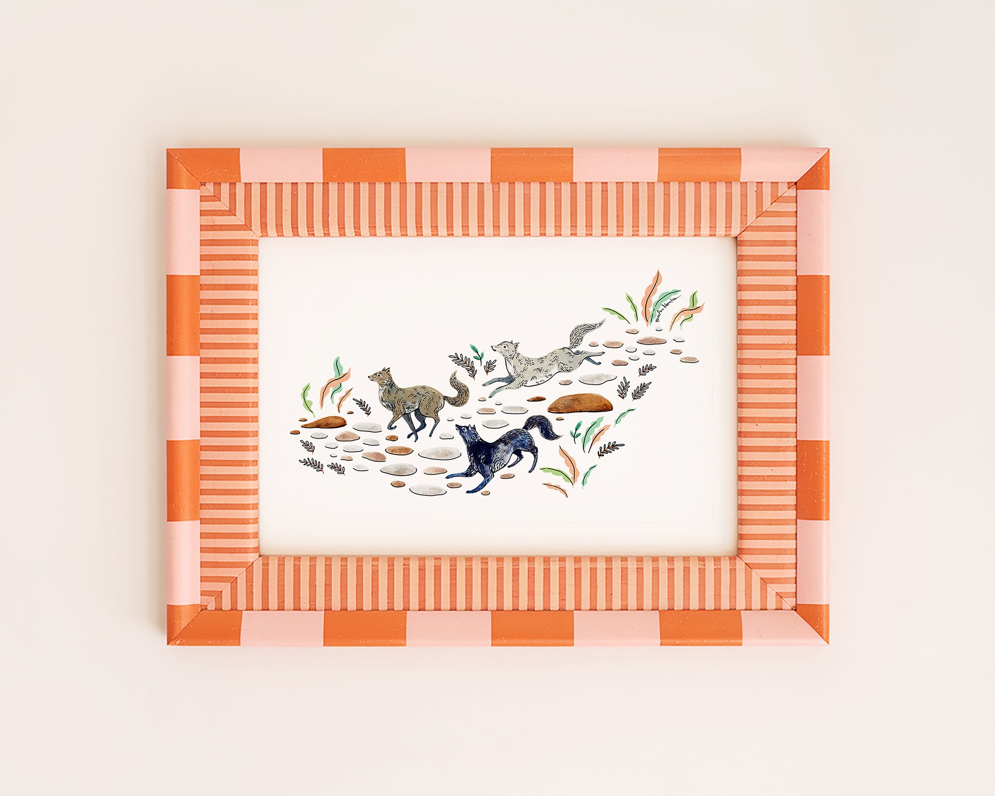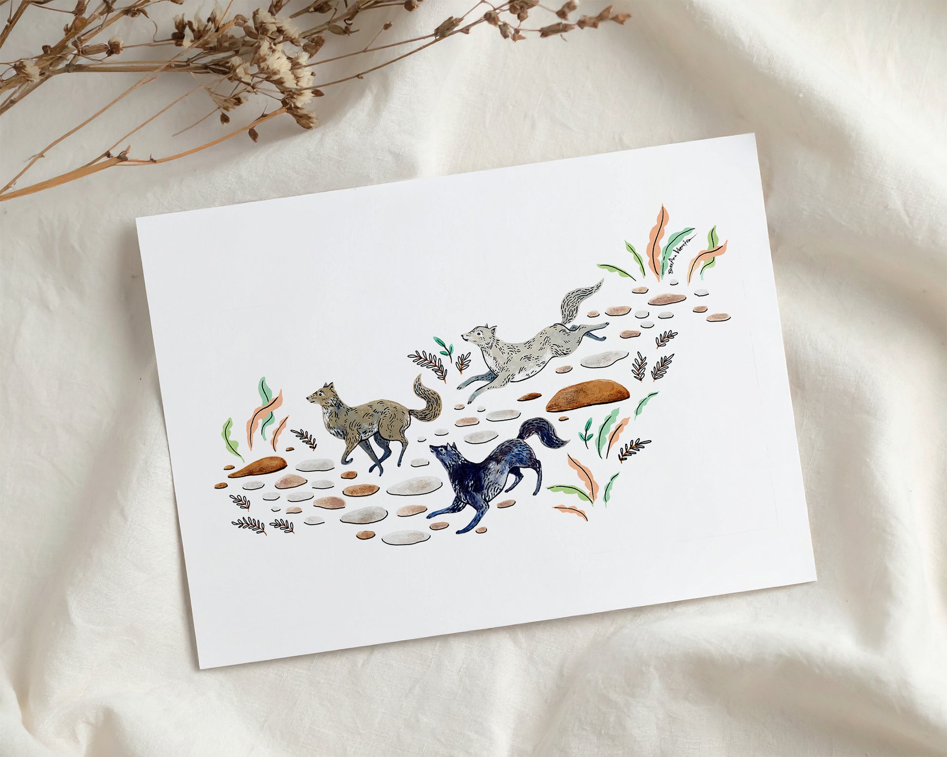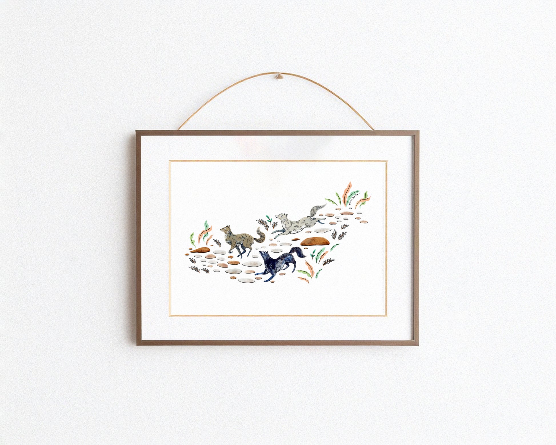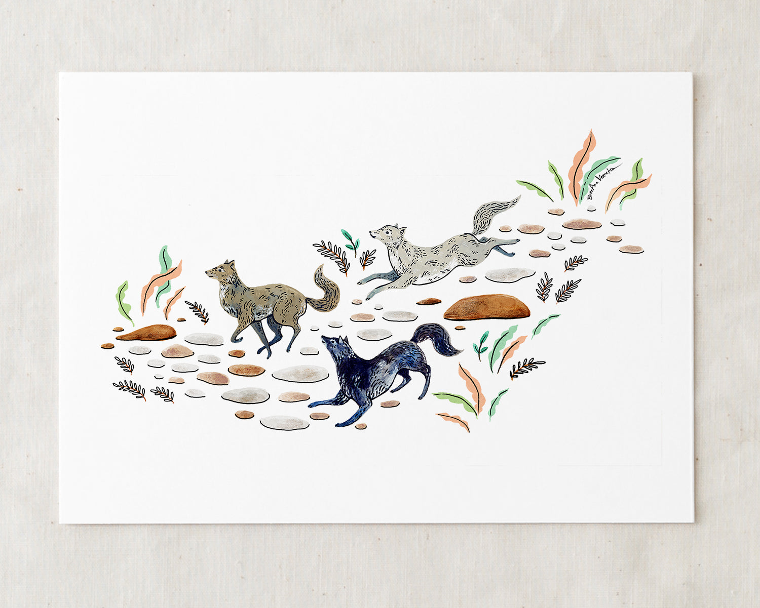 Bring the wilderness indoors with this art print featuring a trio of running wolves.