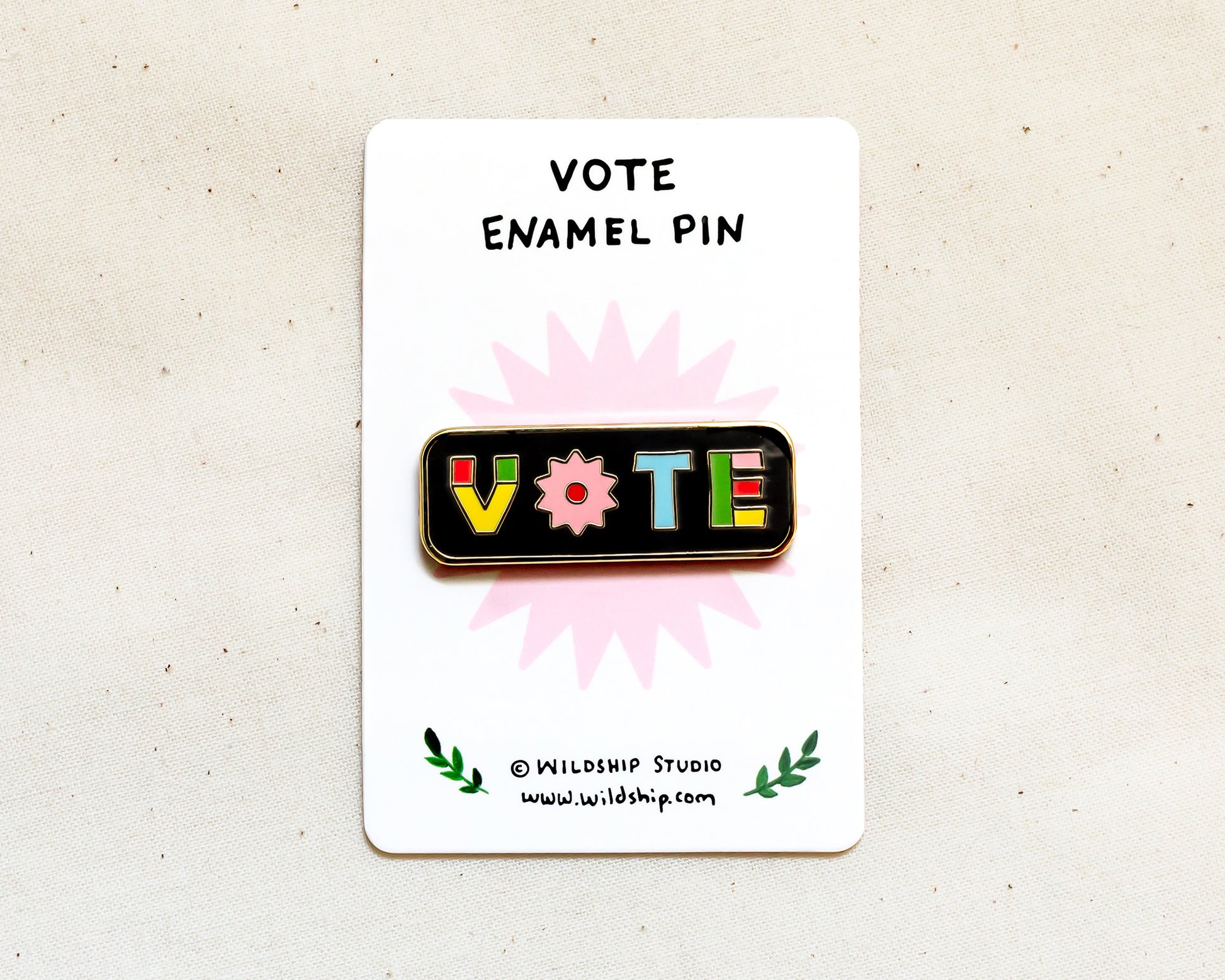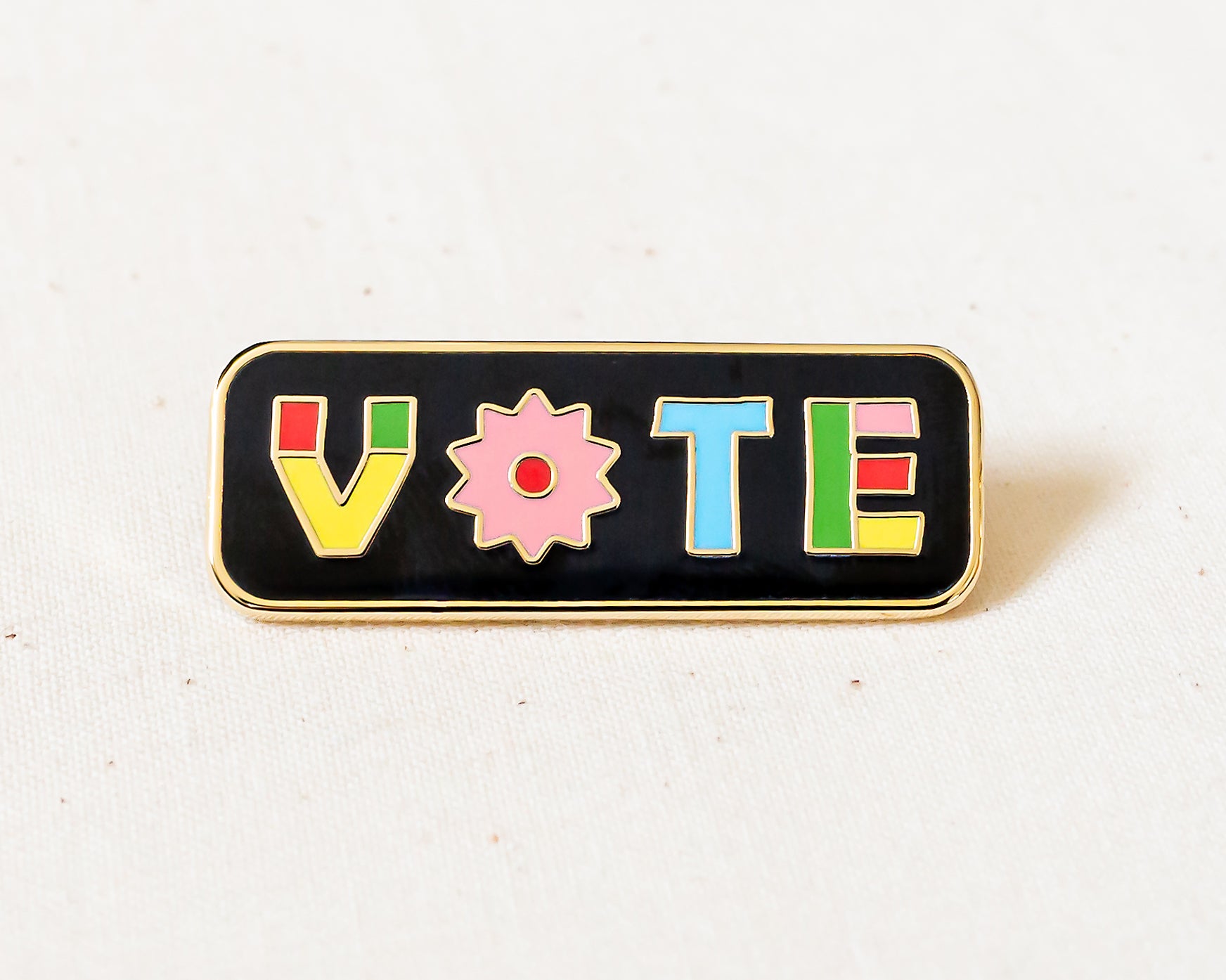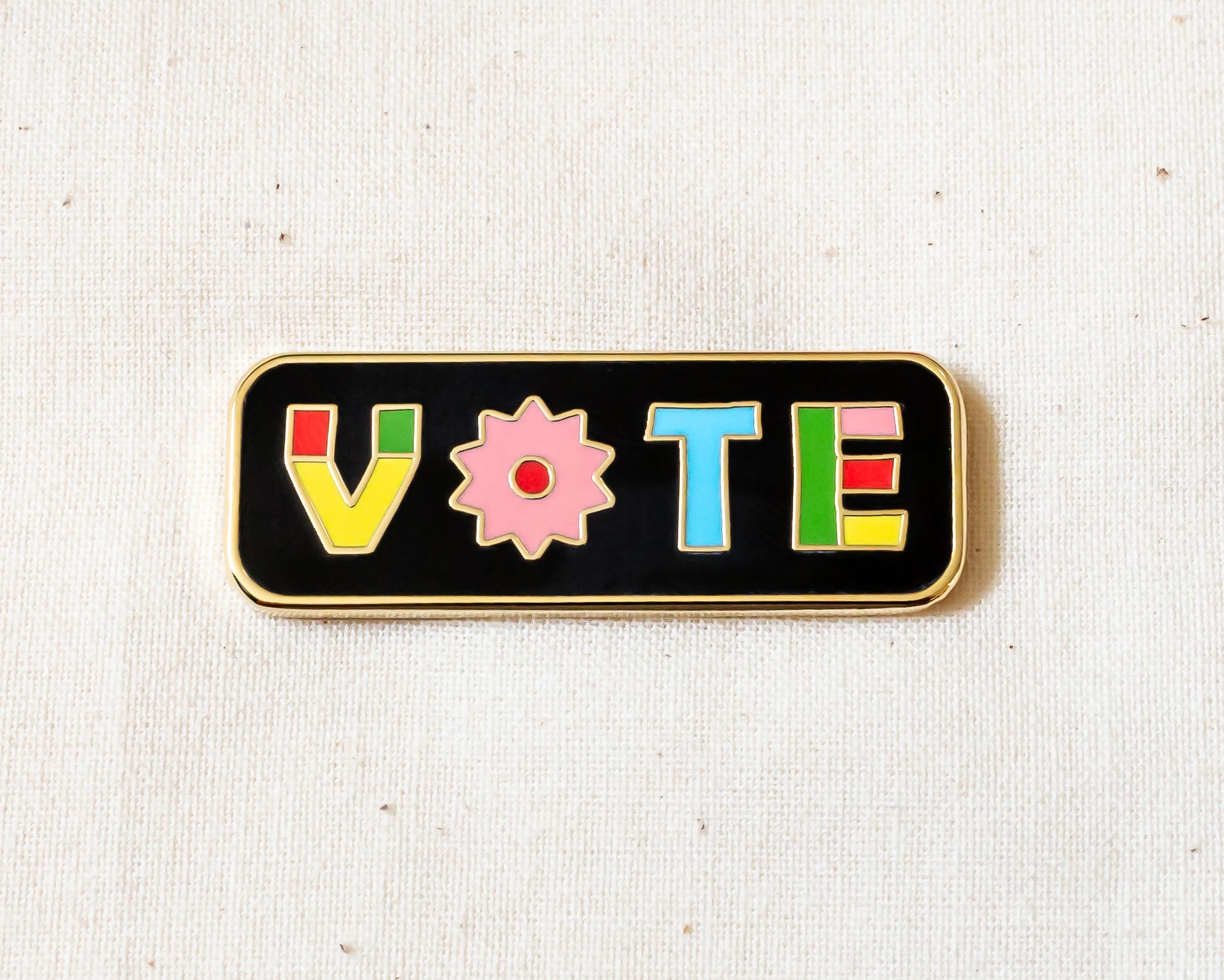 With its vibrant colors and bold “VOTE” declaration, this little gem is more than just a pin – it’s a reminder that your voice matters.